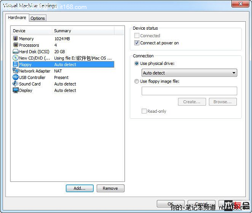 通过双击软件右下角的光驱图标,加载Mac OS X 10.6.3光盘镜像(原文件为dmg文件,为方便VM加载,请用UltraISO转成ISO文件,有些WIN系统能直接识别DMG格式,我的不行,所以转成ISO。)