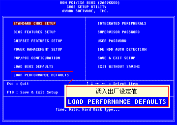 如果在这种设置下,你的电脑出现异常现象,可以用另外这项“Load BIOS Setup” 用来恢复 BIOS 默认值,它是最基本的也是最安全的设置,这种设置下不会出现设置问题,但有可能电脑性能就不能得到最充分的发挥。