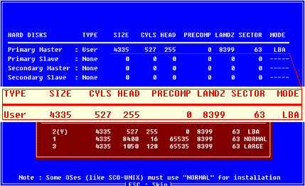 这是硬盘情况,刚才我们检测到的硬盘参数在这里可以看到,这时只有一个硬盘,4335M,有时我们安装了多个硬盘时,想去掉一个硬盘,就要在这里操作,将光标移动到这里,然后按Page up,将其选择为NONE即可。