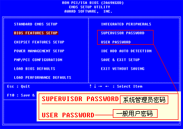 简单地说,如果两个密码都设好了,那么用高级密码可以进入工作状态,也可以进入CMOS设置,而用户密码只能进入工作,也能进入CMOS修改用户自身的密码,但除此之外不能对CMOS进行其它的设置。如果只设置了一个密码,无论是谁,都同时拥有这两个权限。