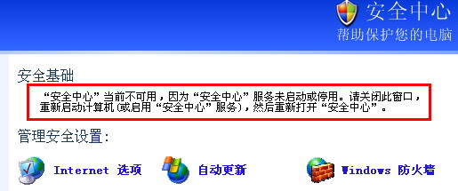 WINDOWS XP 系统打开安全中心提示:“安全中心”现在不可用,因为它相关的服务没有启动或被停止了。请关闭这个窗口并重启电脑(或者启动安全中心服务)然后再次打开“安全中心”。