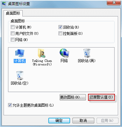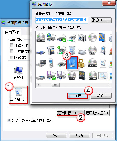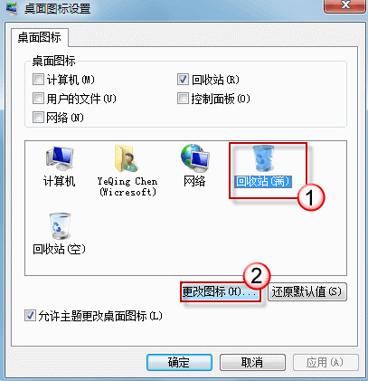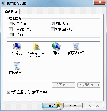 (在桌面图标设置窗口会显示回收站(满)和回收站(空)的图标,即使它们都显示正确,请您任对照下面的步骤再进行一次图标对应操作。)