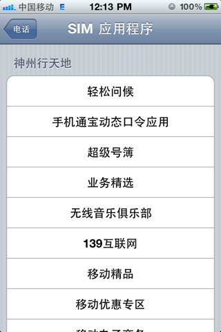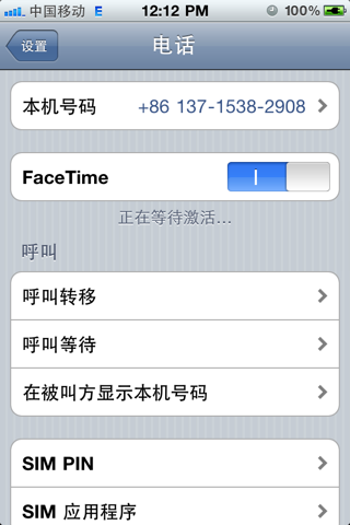 3、返回设置--电话--开启FaceTime后(如果遇到还原后没有facetime的情况,请先把SIM卡拔出,然后插入解决),点击SIM卡应用程序,进入此栏目随意点击一个栏目后返回桌面
