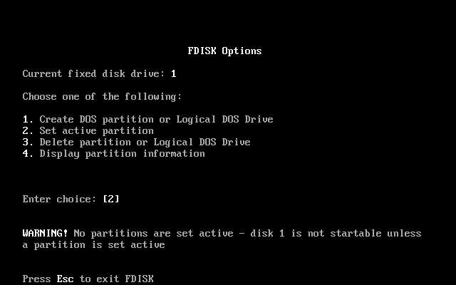 上图中,“警告!没有活动分区”。现在应该设置活动分区了。输入“2”选择第2项(设置活动分区),如下图28所示。