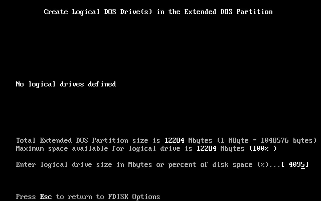 上图中显示出刚创建的主分区(C盘)的参数∶大小为4095MB。主分区建好了,提示按“Esc”键退回主菜单。按Esc键后,退回主菜单出现如下图12所示。
