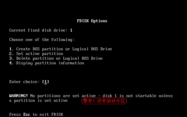 这里有三个选项,各项选项的作用如上图红线指示。选第1项(创建主分区)后,按Enter回车键后,出现如下图5所示。