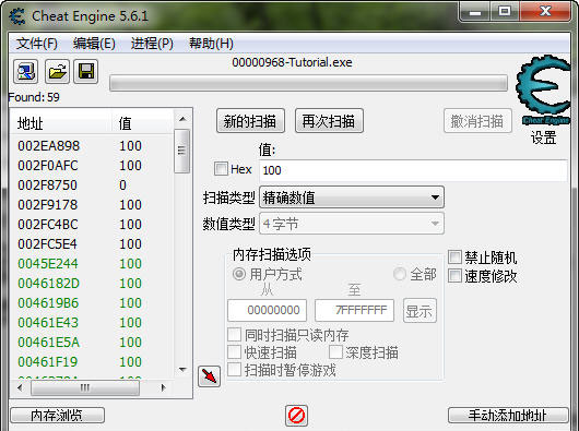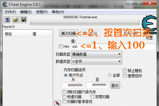 现在开始搜索精确数值 100 数值中输入 100 点击 首次扫描 按钮