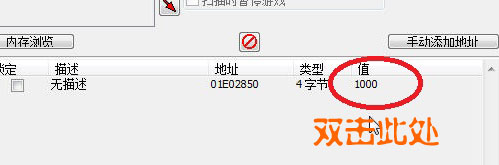 只有1个结果了,这个就是我们要找的内存地址,双击将其加入到地址栏