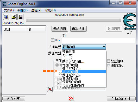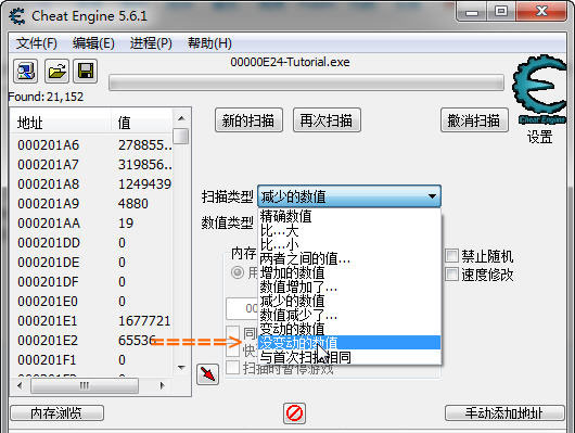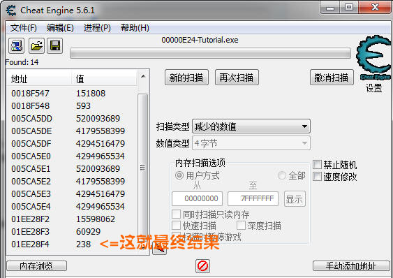 再回到Tutorial ,点击 打我 => 扫描减少了的数值 => 扫描没变动的数值 反复操作,最后就会只剩14个地址