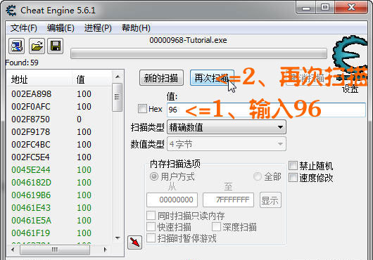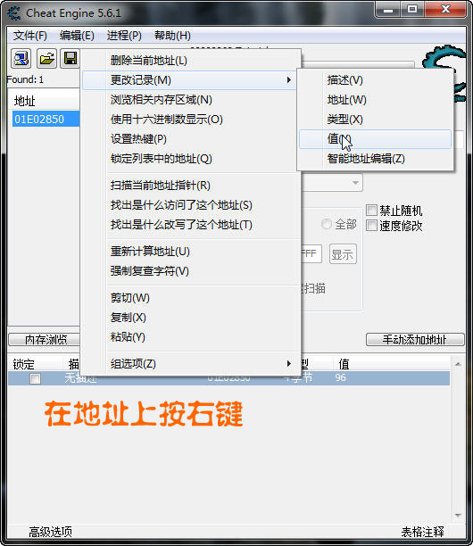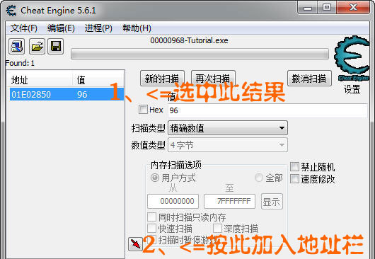 我们再输入 96 点击 再次扫描 按钮 结果只剩1个(这就是我们要找的),我们双击此地址将其添加到地址栏: