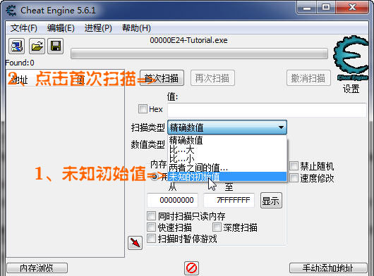 点击 首次扫描 然后出现了肯定是N多的结果,因为太多了,CE没有显示出来。