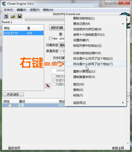 先找到血量的内存地址,不会找的先去看前面几关,这里就不重复了,然后 在地址上 右键=>找出是什么改写了这个地址: