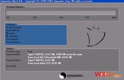 7、如果确认目标分区正确,则可单击“Yes”按钮进入“Symantec Ghost 11.0”界面,开始还原目标分区。