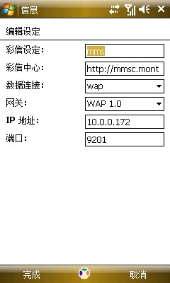 4、下边的彩信设定,原则上名字任选,我是常用的MMS,彩信中心名:http//mmsc.monternet.com,数据连接是之前设置的wap,网关一定要选WAP 1.0(试过用2.0无法发送彩信),IP地址和端口就照写就好。