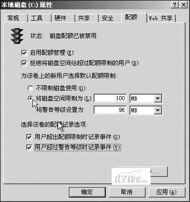 然后在“为该卷上的新用户选择默认配额限制”框中选择“将磁盘空间限制为”单选项,接着在后面的栏中输入100,磁盘容量单位选择为“MB”,然后进行警告等级设置,在“将警告等级设置为”栏中输入“96”, 容量单位也选择为“MB”,这样就完成了默认配额设置。此外,还要选中“用户超出配额限制时记录事件”和“用户超过警告等级时记录事件”复选框,以便将配额告警事件记录到Windows日志中。