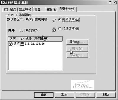 为了保证FTP服务器的安全,还可以拒绝某些IP地址的访问。在默认FTP站点属性对话框中,切换到“目录安全性”标签页,选中“授权访问”单选项(如图3),然后在“以下所列除外”框中点击“添加”按钮,弹出“拒绝以下访问”对话框,这里可以拒绝单个IP地址或一组IP地址访问,以单个IP地址为例,选中“单机”选项,然后在“IP地址”栏中输入该机器的IP地址,最后点击“确定”按钮。这样添加到列表中的IP地址都不能访问FTP服务器了。