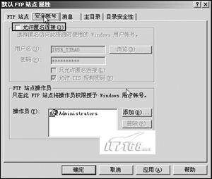 默认情况下,Windows 2000系统的FTP服务器是允许匿名访问的,虽然匿名访问为用户上传、下载文件提供方便,但却存在极大的安全隐患。用户不需要申请合法的账号,就能访问FTP服务器,甚至还可以上传、下载文件,特别对于一些存储重要资料的FTP服务器,很容易出现泄密的情况,因此建议用户取消匿名访问功能。