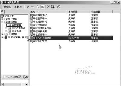在本地安全设置窗口中,依次展开“安全设置→本地策略→审核策略”,然后在右侧的框体中找到“审核账户登录事件”项目(如图4),双击打开该项目,在设置对话框中选中“成功”和“失败”这两项,最后点击“确定”按钮。该策略生效后,FTP用户的每次登录都会被记录到日志中。