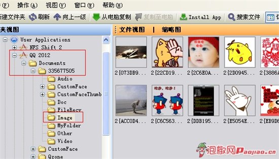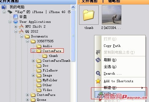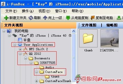 一、 打开iFunbox,依次打开路径:User Applications/QQ2012/Documents/自己的QQ号码(一串数字)/CustomFace,这个CustomFace就是最新版iPhoneQQ2012存放自定义QQ表情的地方。