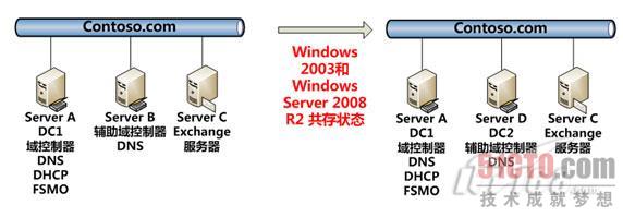 注意:该场景中,Server A同事负责处理DNS、DHCP,本地升级会将所有的DNS、DHCP组件升级到Windows Server 2008 R2版本。