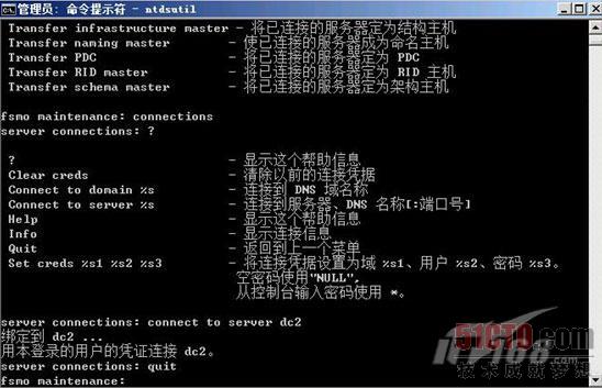 (4) 先连接到将会拥有操作主机角色的Windows Server 2008 R2的域控制器上,键入【Connections】,回车输入【connect to server DC2】,输入【quit】返回上一级菜单。如图2