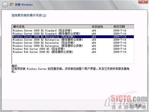 (4) 我这里光盘介质拥有多个版本,根据前面的前提条件,选择【Windows Server 2008 R2 Enterprise 完全安装】,如图4。