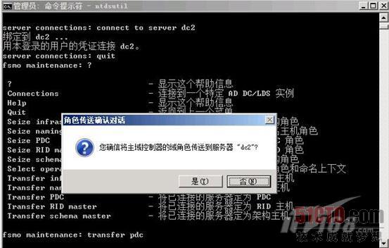 (5) 输入转移相应主机角色的命令,例如现在要转移PDC主机,就输入【Transfer PDC】,回车后,将弹出确认对话框,点击【是】,即开始传输角色。完成后,将显示5个操作主机角色的位置。其他4个角色按此方式分别传输到DC2中。