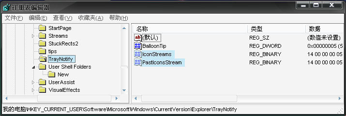 1.“开始→运行”中键入regedit,打开注册表编辑器,展开“HK**_CURRENT_USER\Software\Microsoft\Windows\Curr entVersion\Explorer\TrayNotify”分支,其中“IconStreams”和“PastIconStream”项中分别存储着“当前项目”和“过去的项目”,将“TrayNotify”项删除。
