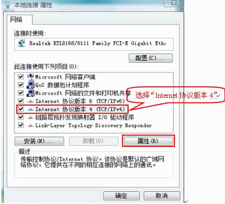 在网卡对应的“本地连接”选择“属性”→“网络”→“Internet协议版本4(TCP/IPv4)”,点击“属性”: