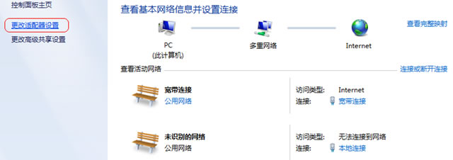 右击桌面“网上邻居”->选择“属性”,打开网络共享中心,在网络管理侧边栏中选择“更改适配器设置”: