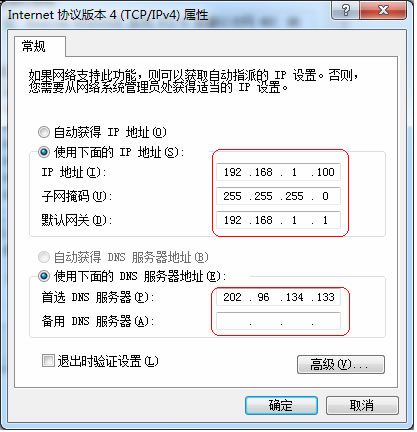 (也可将IP地址设置为自动获取,DNS建议手动指定)