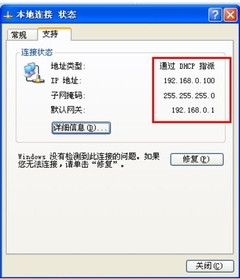 此计算机已经成功的从路由器(192.168.0.1)上获得192.168.0.100这个IP地址。