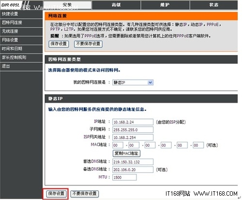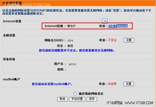 在这个图中,可以看到路由器已经成功侦测出我当前的上网类型是静态IP,已经成功连接到internet。