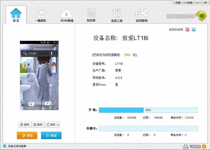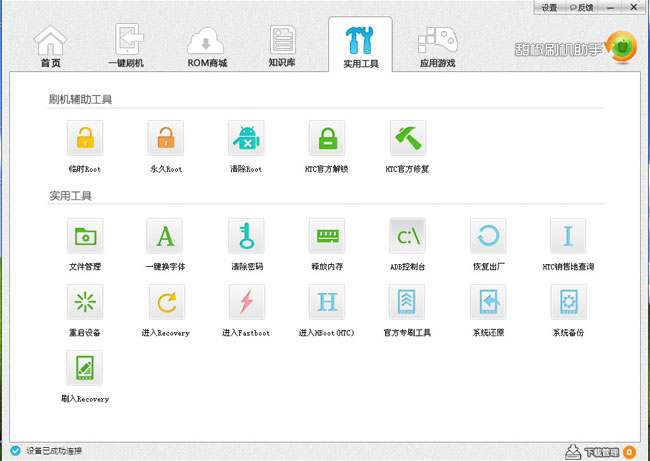 第四步、看你的手机是否ROOT了,如果还没有ROOT的,就打开实用工具,用永久ROOT或者临时ROOT都不影响刷机,都可交换试下。ROOT若失败,请多尝试几次。再不行,那么你的手机就比较有个性了,非得手动ROOT不可。(进入“知识库”,找到你的机型,就看到如何手动ROOT了,ROOT工具用不了的,才使用手动,这里不多讲)