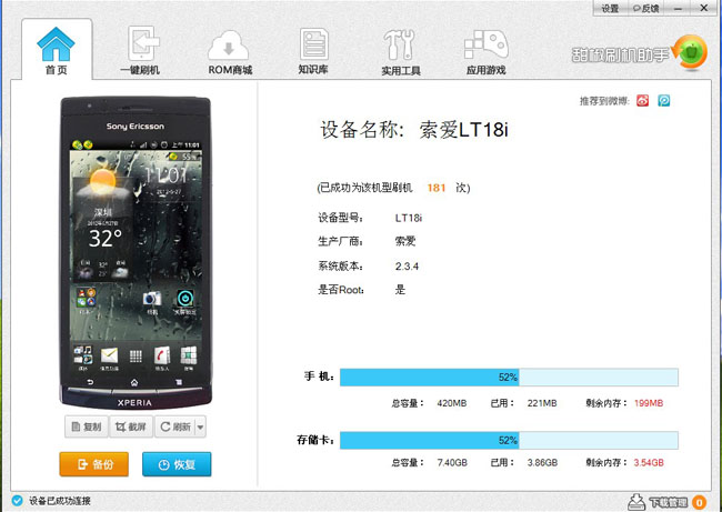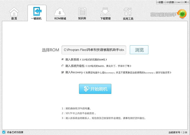 第三步、安装完成驱动后,在甜椒主页显示你机器的信息,这时你就可以刷机了。别急,先要备份资料: