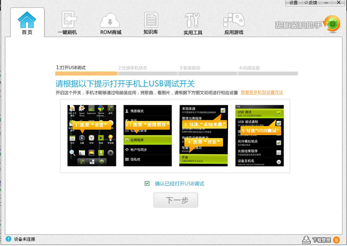 第二步、看下手机设置是否正确(打开手机设置→应用→安装开发调试,开启USB调试),并通过usb 连接电脑,这时甜椒就会自动监测手机驱动、usb驱动。按照提示点击鼠标就行了,简单到极点了。
