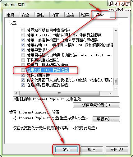 3、在IE浏览器的“Internet选项”中,把“高级”里的“显示友好HTTP错误信息”的小勾勾去掉。
