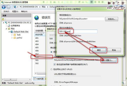 2、然后在“错误页”设置选项里,双击 500 那一行,再点文件按路径后面的“设置”。在跳出的对话框中将“相对文件路径”里默认的文件名“500.htm”改为“500-100.asp”,确定。