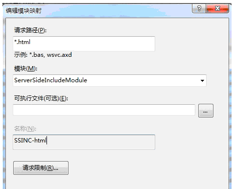 添加模块映射 请求路径 *.html 模块选择 ServerSideIncludeModule,名称填写:SSINC-html