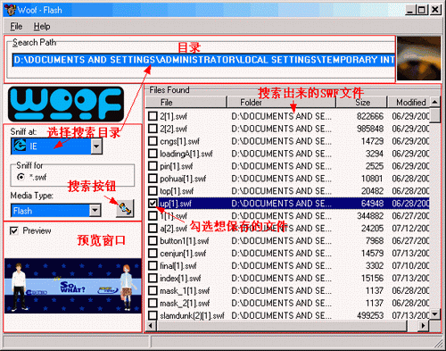 现在到了隆重推荐时刻,非常可爱的woof千里迢迢从家里(http://www8.pconline.com.cn/download/swdetail.phtml?id=5048)赶到了我的面前,嬉皮笑脸地对我说,让它来露露脸。好吧,看在它那迷人的脸蛋上,我就向大家讲讲用它查找硬盘上的SWF文件。