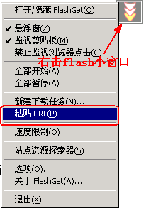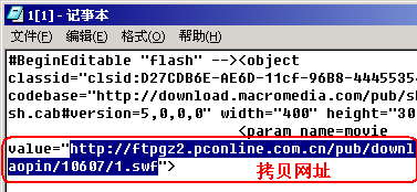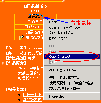 有很多网站为了方便网友看FLASH作品,常常提供了全屏欣赏,这种方式最受笔者的欢迎了,只要直接在链接上按鼠标的右键,选择“复制快捷方式(copy url)”,然后到下载工具上粘贴地址链接URL(如上法),这个FLASH作品又乖乖地归到硬盘上去了。