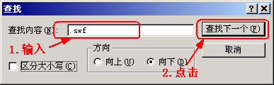 按下快捷键“Ctrl + F”,在弹出的对话框中输入“.swf”,确定即可查找到FLASH的SWF文件,COPY下链接地址,注意看是绝对链接还是相对链接。