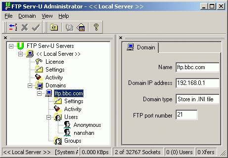 4、从上图中可以看到,现在已经建立好了一个FTP服务器,服务器地址为“ftp.bbb.com”,其下有两个用户,一个是匿名用户“Anonymous”,其密码为空;一个是普通用户“nanshan”,其密码为在向导中输入的内容。