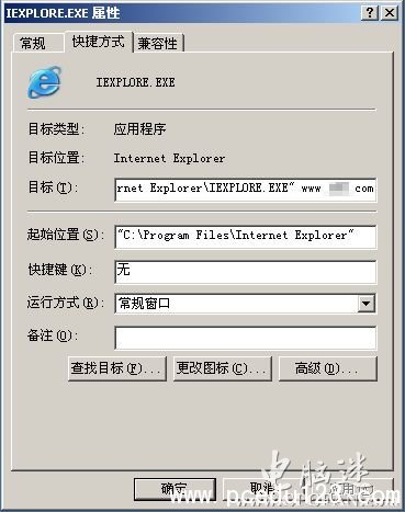 接下来同样通过修改和创建注册表信息,给这个IE快捷方式创建相应的右键命令,也就是说这些命令都是黑客自定义出来的。可能有的读者会问,为什么在注册表里面找不到链接的网站,而且在Internet选项里面也看不到网站链接。这是因为黑客并没有将网站链接放到注册表,而是放到这个快捷方式属性中的“目标”选项后(如图2)。这样在打开这个快捷方式的时候,就会自动链接到指定的网页链接上,同时这种方式也可能会影响到真正的IE图标。