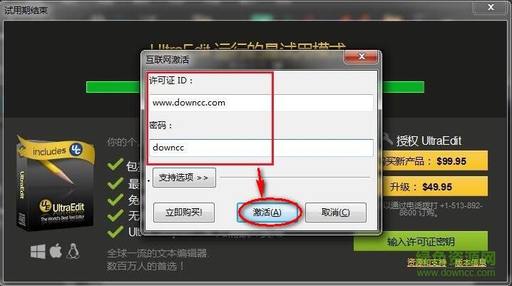 2.先断网、断网、断网(重要的事情说三遍,不然无法继续的),许可证id填:www.downcc.com,密码填:downcc(要记住,等会要用到),然后点击”激活“按钮