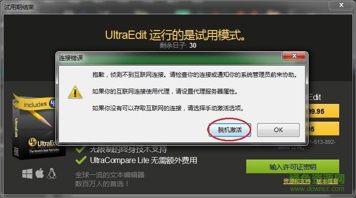 3.上面操作完成后,会提示”连接错误“,我们点击”脱机激活“,会生成一串信息,如下图