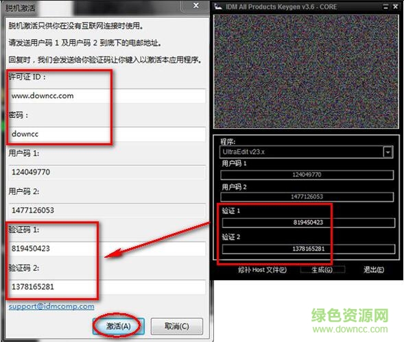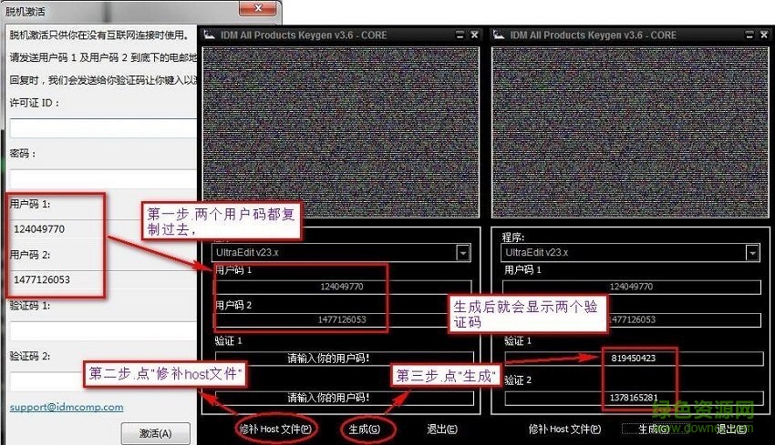 4.打开压缩包中的注册机(由于注册机会被误报,所以小编加密了,解压密码:www.downcc.com,大家可以放心使用,亲测无毒),将”脱机激活“里面的用户码1和用户码2填入注册机对应位置,然后点击”修改host文件“,再点击”生成“,就会显示验证码