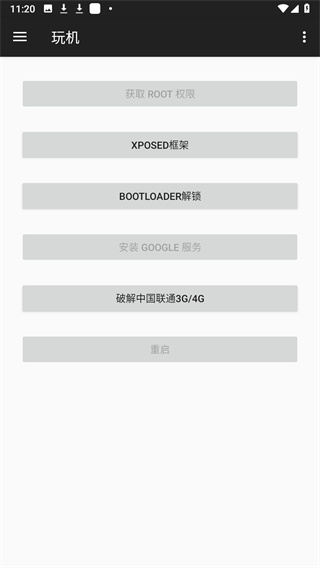 一键获取ROOT权限、XPOSED框架、BOOTLOADER解锁、安装GOOGLE服务、破解中国联通3G/4G、重启。