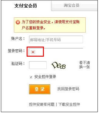 如果没有安装支付宝安全控件,密码框会出现红叉叉。
