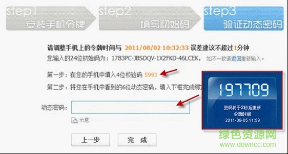 4、输入QQ安全中心(手机令牌)上提示的24位初始码到网页提示位置,并点击【下一步】。输入网页返回的4位校验码到手机,并点击【校准时间】。